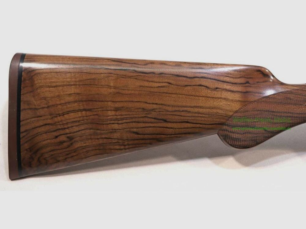 Zustandsbeschreibung: 1-2 (altersbedingt)Baujahr: um 1920, Zustand: 1-2 (altersbedingt), Lauflänge: 74,5 cm, Gesamtlänge: 118 cmPerfekt restauriert in Holz und Stahl, mit patentiertem ohne Werkzeug von Hand herausnehmbarem Anson-Schloss, eine aufwändige Innovation, welche zu dieser Zeit den europäischen Flintenmarkt stark beeinflusste (auch in England), durch das schneller schlagende (verbesserte Zündverzugszeit) Anson-Schloss-System, feinste meisterliche Verarbeitung in Stahl und Holz, vorwiegend für den englisch sprechenden Übersee-Markt hergestellt und vertrieben durch die bekannte und auf dem Abzugsbügel signierte W. Glaser Zürich, Doppelabzug mit Ejektor nach H & H, (rechter Ejektorfeder schwach), Läufe aus rostträgem "Böhler Antinit-Laufstahl", Choke 1/1 - 1/1 (Weitschuss-Flinte mit Verwendung von Streupatronen perfekt auch für Bau- und Buschier-Jagd), massiver tiefgelegter und verriegelter Laufhaken-Verschluss mit zusätzlichen beidseitigen Stützwangen durch Laufverlängerung, klassische belgische Schaftform, neutraler backenloser Hinterschaft mit Pfeiffenkopf-Pistolengriff, Schaftlänge einschl. Slipkappe: 370 mm, Halbbiberschwanz-Vorderschaft mit Purdey-Schnepper, aus hochwertigem belgischen marmoriertem Maserholz Klasse 7-8, Vorder- und Hinterschaft aus einem Stück gearbeitet ...ein Traum für den Flintenliebhaber und Kenner oder System-Sammler, zum Sammeln und Schießen... ...TOP-RARITÄT