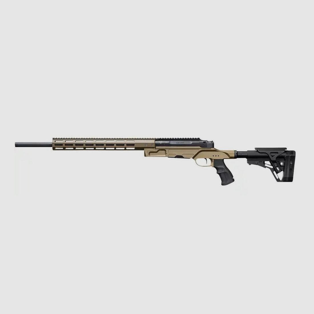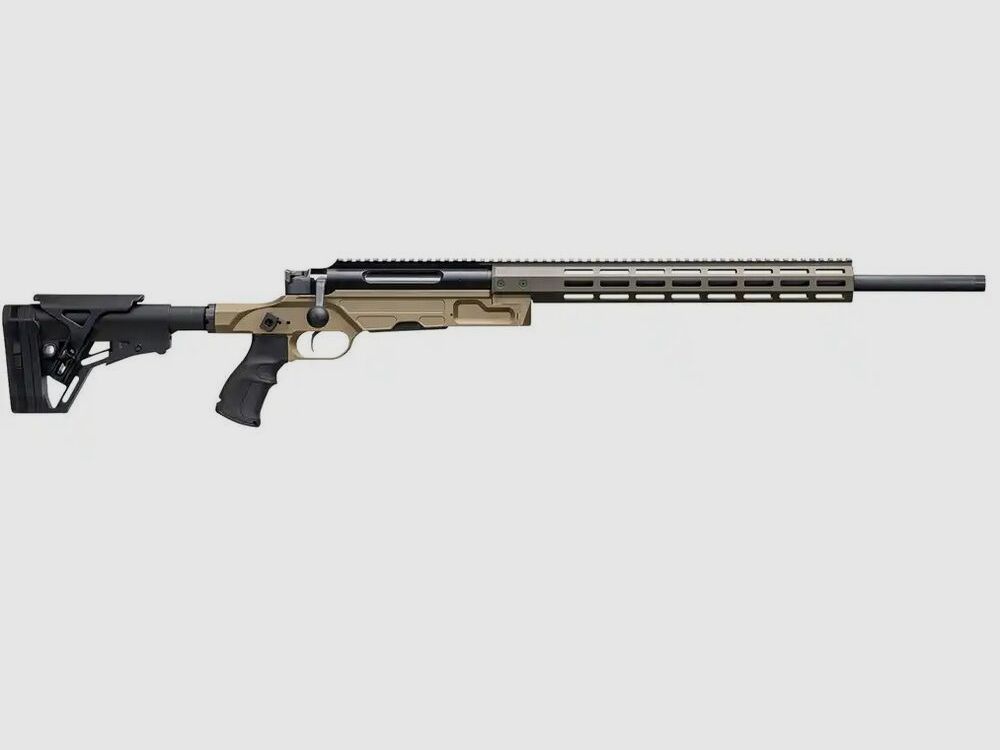 Präzision und Power: Die HAENEL Repetierbüchse LR/ONETechnische Spezifikationen der HAENEL Repetierbüchse LR/ONEDie HAENEL Repetierbüchse LR/ONE ist eine ausgeklügelte Langwaffe mit einem Kaliber von .308 Win. und einer Lauflänge von 600 mm. Mit einem Laufdurchmesser von 20 mm und einer Dralllänge von 30,5 cm erreicht man mit diesem Modell eine beeindruckende Genauigkeit. Die Anzahl der Züge liegt bei 4 und der Lauf ist gehämmert, was zur Abriebfestigkeit und Langlebigkeit beiträgt. Das Zündsystem dieses Präzisionsgewehrs basiert auf Perkussion. Dies sogt für eine schnelle und zuverlässige Zündung.Feinste Details: Das System und der AbzugDas System der HAENEL Repetierbüchse LR/ONE setzt auf einen Zylinderverschluss mit einem 60 Grad Öffnungswinkel. Dies ermöglicht schnelles und sicheres Repetieren. Außerdem ist das Gewehr mit einem Direktabzug ausgestattet, dessen Abzugsgewicht zwischen 900 und 1.100 Gramm liegt. Ein weiteres wichtiges Merkmal ist die 3-Stellung-Schlagbolzensicherung, die die Handhabung noch sicherer macht.Fokus auf Präzision: Visierung und MontageDie HAENEL Repetierbüchse LR/ONE kommt ohne direkt eingebaute Visierung und ist stattdessen auf Zielfernrohrmontage ausgelegt. Hierfür ist sie bereits vorbereitet und mit einer NAR-Schiene ausgestattet. Zum Laden dient ein praktisches 5-Schuss-Steckmagazin.Komfort und Haltbarkeit: Schaft und MaterialDer Schaft der HAENEL Repetierbüchse LR/ONE besteht aus einer robusten Kombination aus Kunststoff und Aluminium. Das HAENEL Chassis ist mit einer HAENEL AR-Schulterstütze versehen. Zudem lässt sich die Wangenauflage individuell einstellen und auch die Schulterstützenkappe kann in der Höhe verstellt werden. Zusätzlich kann auch die verstellbare Daumenauflage beidseitig umgebaut werden. Dies gewährleistet eine angenehme Passform und optimale Anpassung an den Schützen. Die Repetierbüchse gewährt eine perfekte Balance zwischen Größe, Gewicht und Handling.Design und FarbeDie Waffe ist in klassischem Schwarz/Sand gehalten. Die HAENEL Repetierbüchse LR/ONE präsentiert sich mit einem ansprechenden und zugleich zweckmäßigen Design.Zusammenfassend kann gesagt werden, dass sie eine hervorragende Wahl für Sport- und Long-Range-Schießen ist. Mit ihrer beeindruckenden Präzision, den durchdachten Details und dem hohen Komfort setzt sie neue Maßstäbe in ihrer Klasse.Technische Daten:Kaliber: .308 Win.Lauflänge: 600 mmLaufdurchmesser: 20 mmDralllänge: 30,5 cmAnzahl der Züge: 4Mündungsgewinde: M15x1Zündsystem: PerkussionSystem: Zylinderverschluss mit 60° ÖffnungswinkelAbzug: DirektabzugAbzugsgewicht: ca. 900 - 1.100 gSicherung: 3-Stellung-SchlagbolzensicherungVisierung: ohneVorbereitet für ZielfernrohrmontageMontageschiene: NAR-SchieneMagazinkapazität: 5 SchussSchaftmaterial: Kunststoff und AluminiumHAENEL Chassis mit HAENEL AR-Schulterstütze, Wangenauflage verstellbar (+ 22 mm), Schulterstützenkappe in der Höhe einstellbar (± 30 mm), verstellbare Daumenauflage (beidseitig umbaubar)Maße (LxBxH): 1070-1150x90x195 mmGewicht: 4.700 gAbgebildete Optik, Montage und evtl. weitere Zubehörteile sind nicht im Preis enthalten.